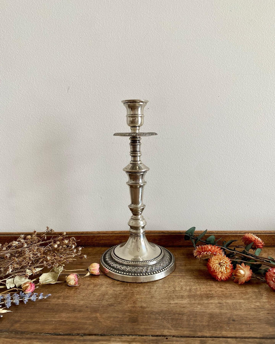 Élégant bougeoir en métal argenté avec sa base travaillée.