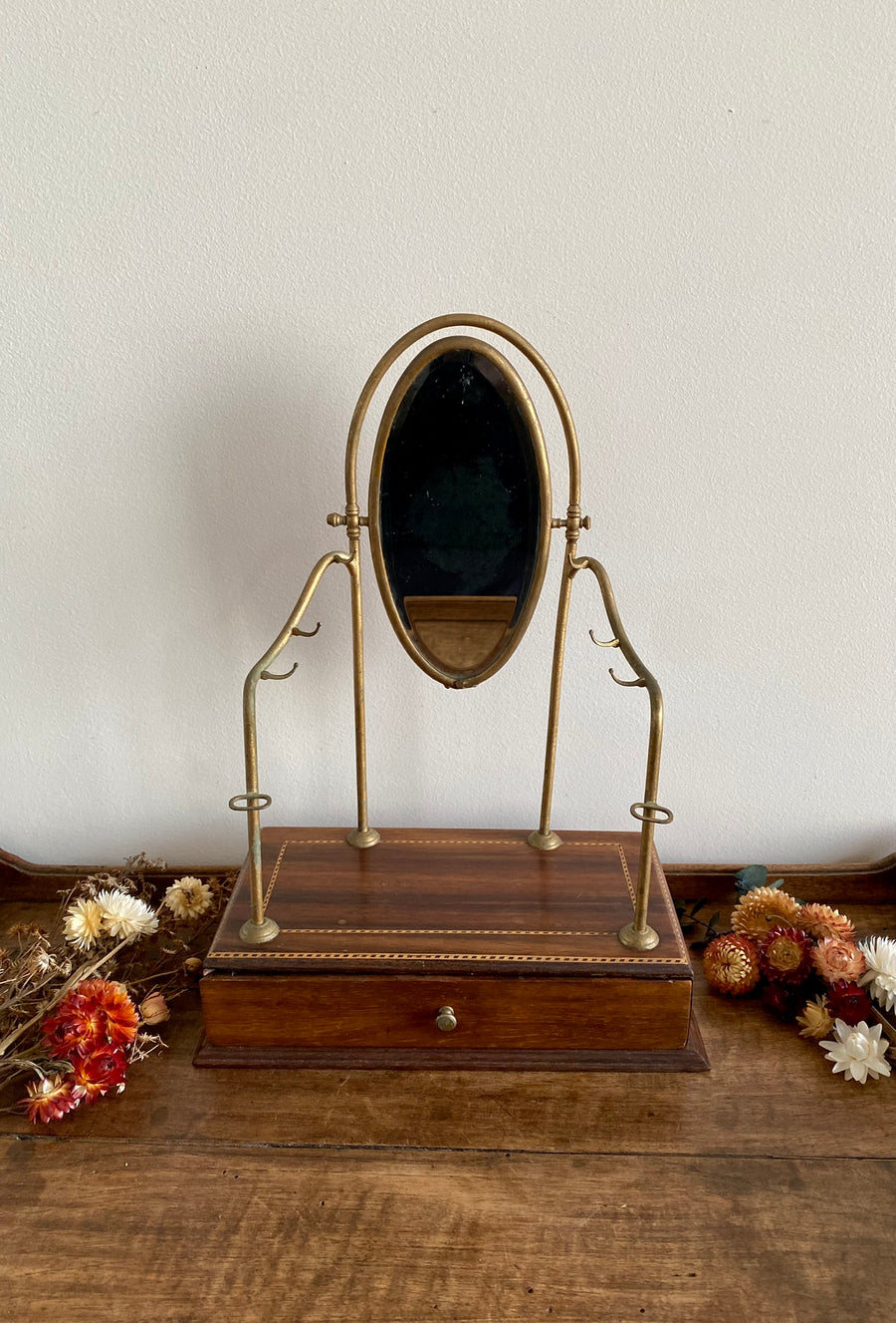 Charmant petit miroir psyché de chambre. On adore sa glace biseautée. Bois façon placage et tiroir incorporé. Vous pourrez y accrocher vos jolies bagues ou bracelets préférés ! Estimation fin 19ème début 20ème. Quelques jolies imperfections sont à noter et visibles sur les photos, attendues vu son grand âge!