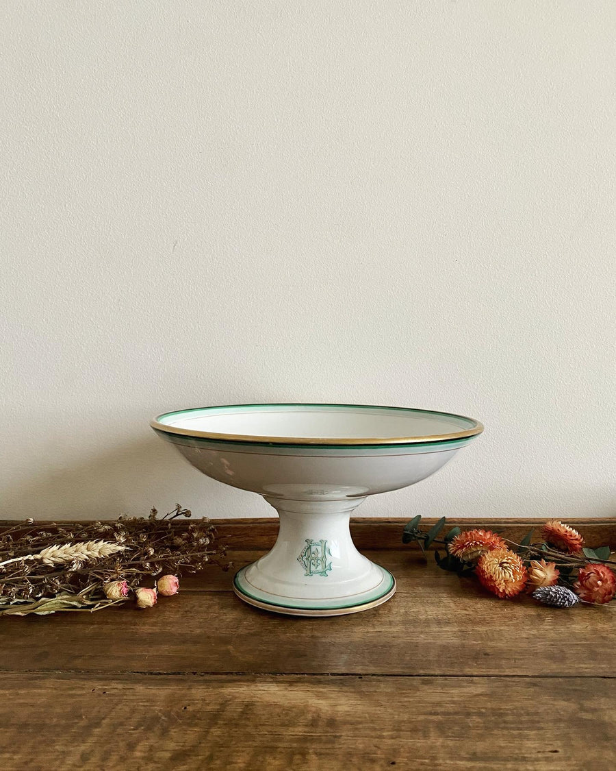 Compotier sur pied de la deuxième moitié du 19eme. Manufacture Jullien Fils Ainé Paris 63 Fg Poissonnière. à l’allure à la fois moderne et vintage avec ses deux bordures or et vert bouteille. Service datant de 1855-1860 si l’on en juge par la signature.