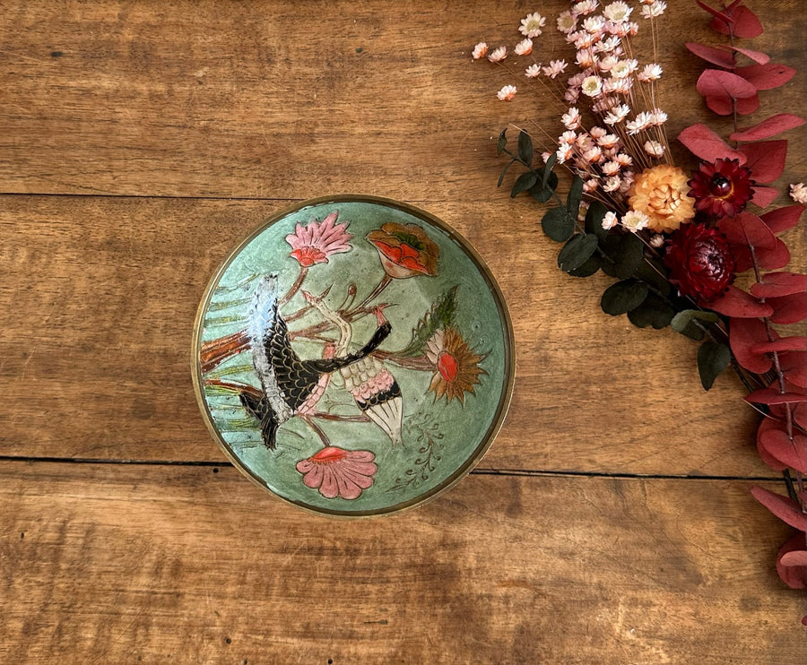 Jolie coupelle en laiton émaillé. Décoration de deux cygnes parmi les fleurs. Objet ancien présentant des traces du temps