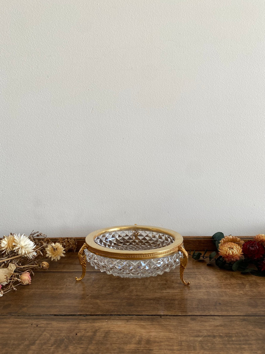 Coupelle en verre taillé armature dorée sur pieds