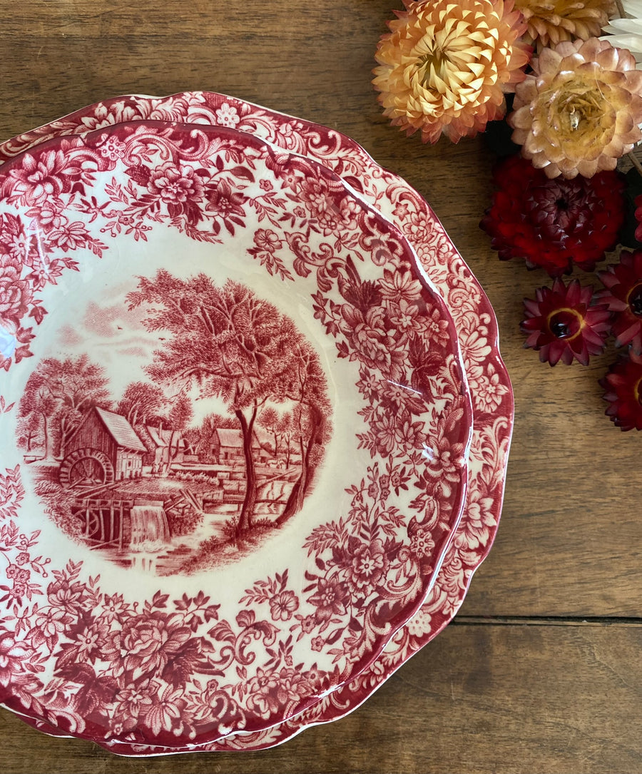 Ravissant ensemble composé d'une petite assiette et d'un bol en porcelaine assorti. Signé Johnson Bros. Mill Stream Made in England. Vendus ensemble.