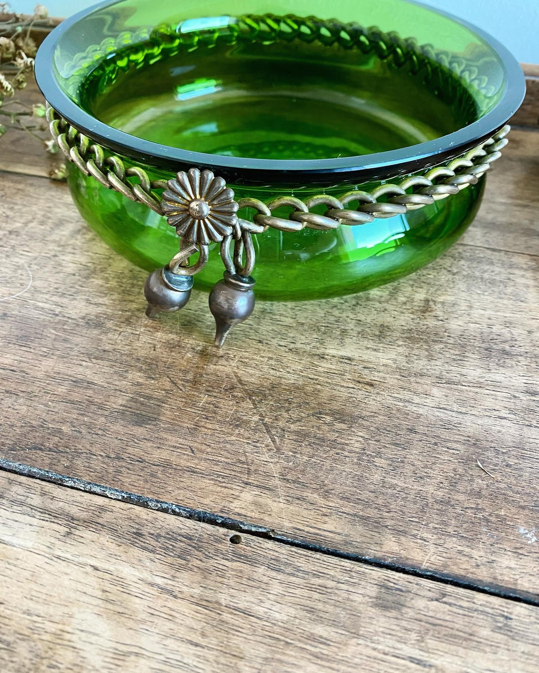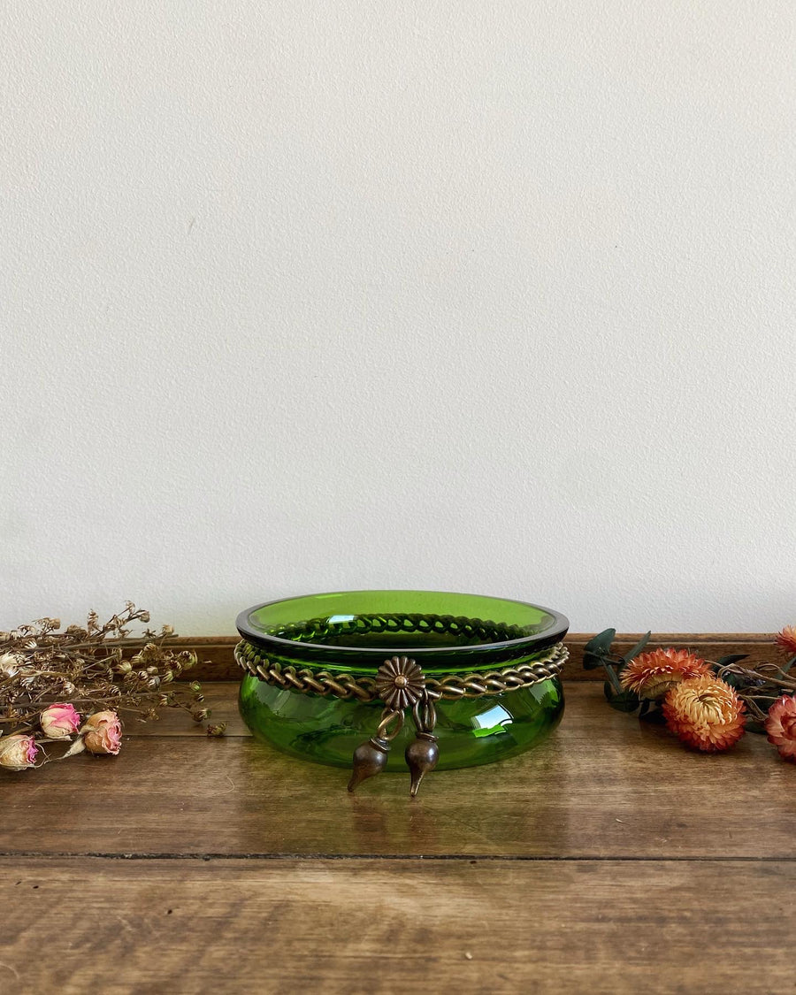 Très élégante coupelle vintage en verre couleur “vert bouteille” cerclée d’une chaînette décorative
