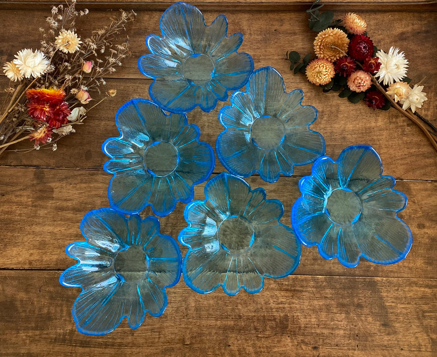 Jolies coupelles bleues en verre en forme de fleurs, idéales pour servir le dessert ! Vendues ensemble