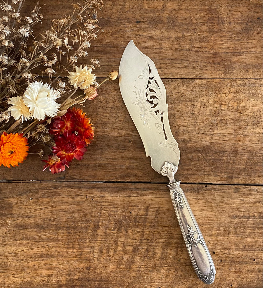 Beau couteau en métal argenté avec sa lame ajourée et ornée de fleurs gravées