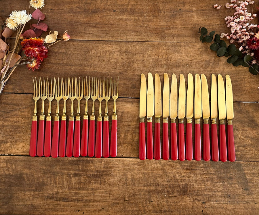 Lot composé de 12 fourchettes et 12 couteaux à dessert, en laiton et bakélite.