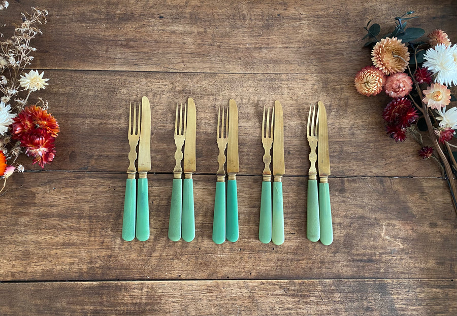 Lot de petits couverts à dessert avec leurs manches en bakélite vert. Vendus ensemble.