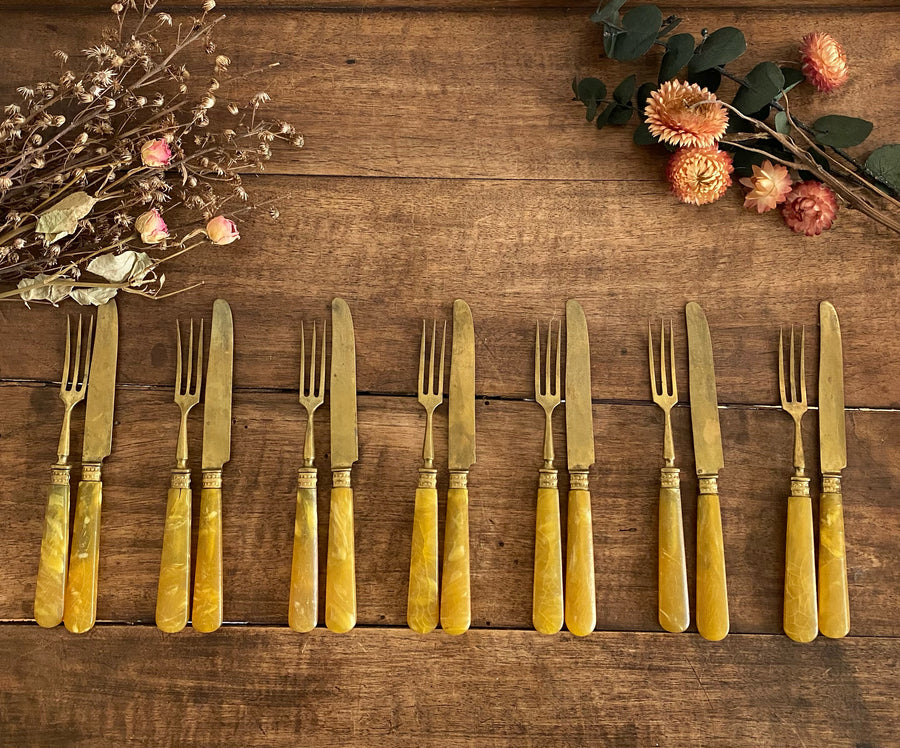 Lot de 7 jolis petits couverts à fruits de mer ou à dessert anciens en métal doré à manche jaune. Couverts anciens qui présentent des petites fêlures du temps indiquées sur les photos.