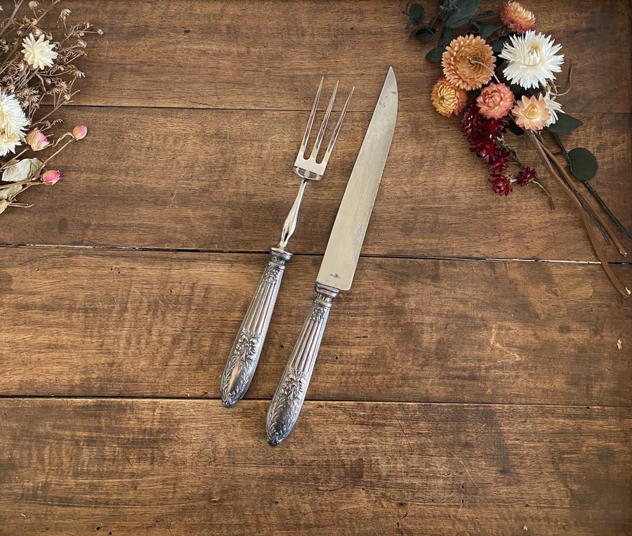 Ensemble de deux jolis couverts de service en métal argenté dans leur jus.