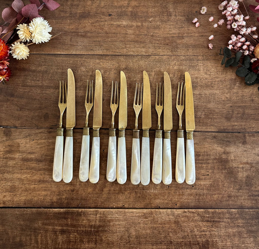 Ravissant lot de petits couverts à dessert en laiton et nacre. A noter, un des couverts présente un petit manque discret, visible sur les photos.