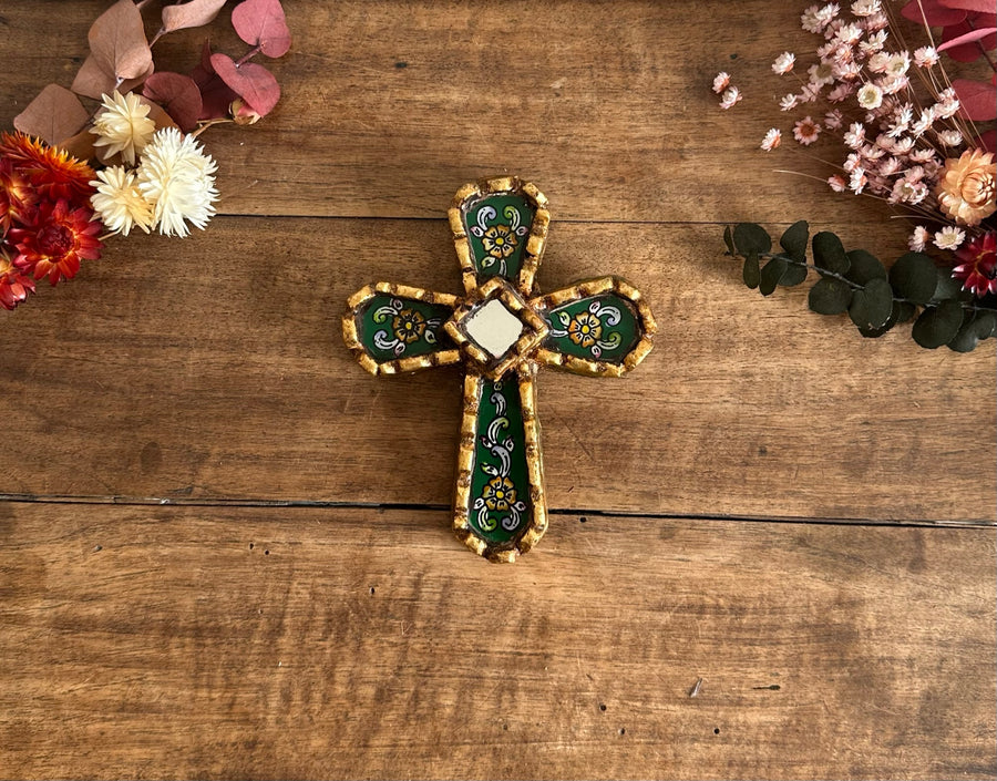 Jolie petite croix péruvienne émaillée. Charmants détails colorés rehaussés d'un pourtour doré. Petit miroir en son centre. Estimation années 60.