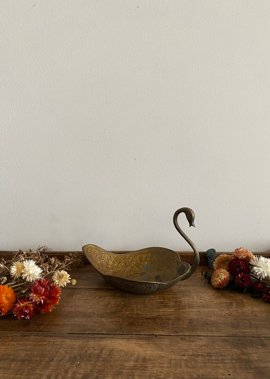 Ravissante coupelle vide poche en forme de cygne en laiton émaillé. Décor de jolis oiseaux.