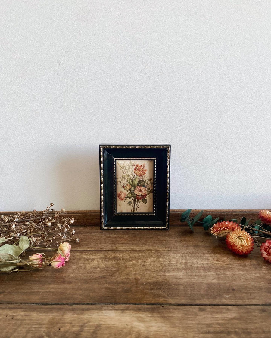 Délicat bouquet de roses peint sur soie dans son charmant petit cadre noir et doré.