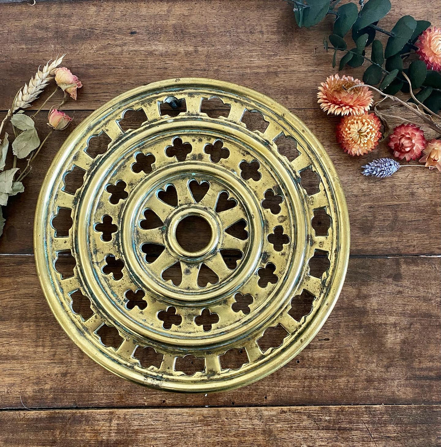 Joli dessous de plat rond en laiton à trois pieds présenté dans toute son authenticité et ses imperfections.