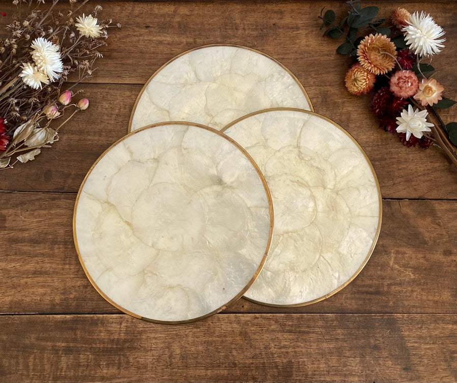 Ravissant lot de 3 dessous de plats nacrés cerclés de laiton doré. Dessous en liège. Peuvent également être utilisés comme plateaux de présentation. Vendus ensemble