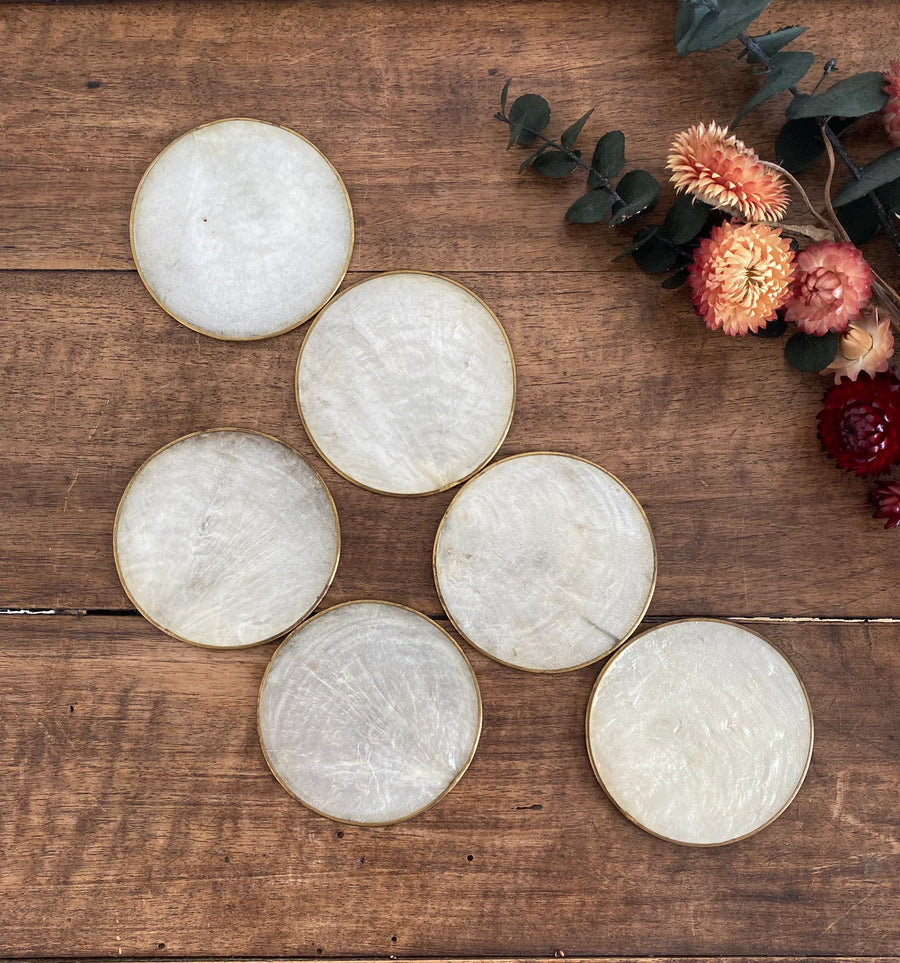 Vous aviez adoré la première série, en voici donc une seconde ! Ensemble de 6 jolis sous-verres en nacre cerclée de laiton cette fois-ci le dessous n'est pas en liège mais bien en nacre des deux cotés.