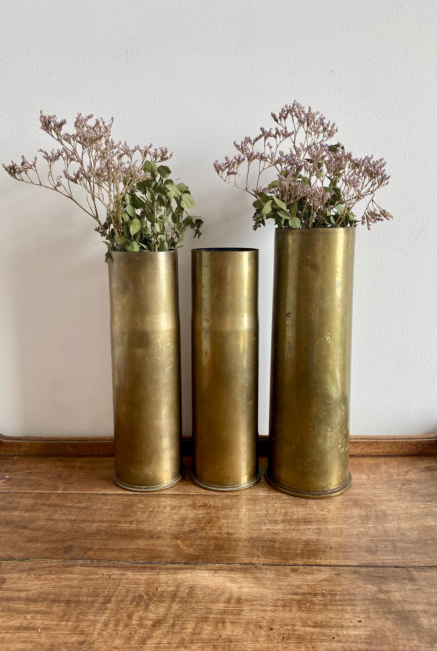 Lot de 3 vases en laiton, à l’origine des douilles d'obus des deux guerres ! Ils datent de 1917 et de 1941. Faites des vases pas la guerre…!