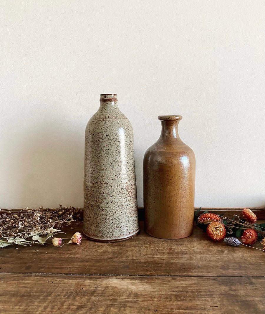 Duo de vases en grès vintage, l’un couleur marron glacé, l’autre gris et marron irisé, parfaitement en harmonie pour faire entrer le soleil chez vous avec un joli bouquet de fleurs.
