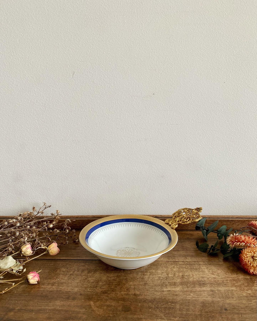 Ravissante écuelle en porcelaine blanche avec son galon doré, son liseré bleu et un joli manche en métal doré sculpté - Winterling Bavaria