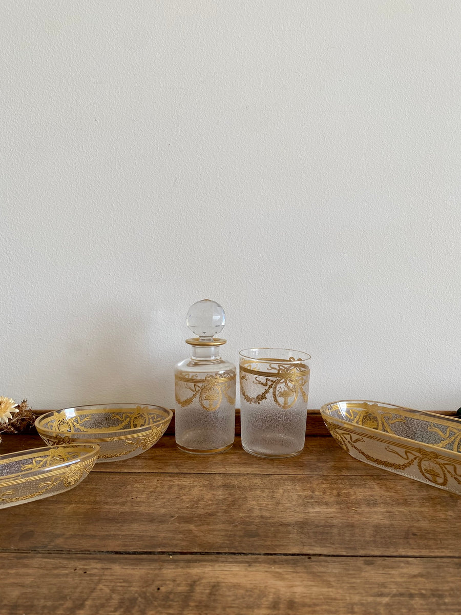 Nous n'avons pu résister face à ce bel ensemble de toilette en cristal Saint Louis signé. Années 1900 époque empire. Délicates frises dorées et dorures anciennes, cet ensemble saura se mêler au moderne et sublimer l'ancien !