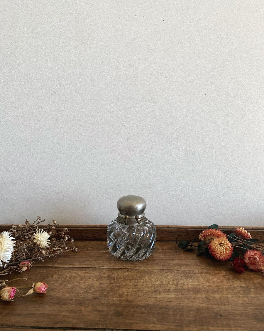 Joli petit encrier rond en verre moulé avec son bouchon en métal argenté.