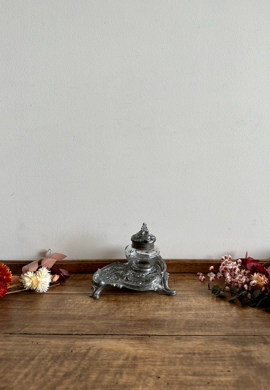 Adorable petit encrier en fonte sur pied doté d'un joli réservoir en verre. Pièce présentant une jolie patine. Estimation début XXème.