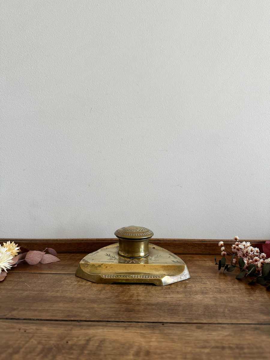 Adorable petit encrier en laiton gravé. Epoque 1900. On aime particulièrement ses jolies décorations gravées. Un petit pot en verre contemporain mais parfaitement adapté vient à le compléter.