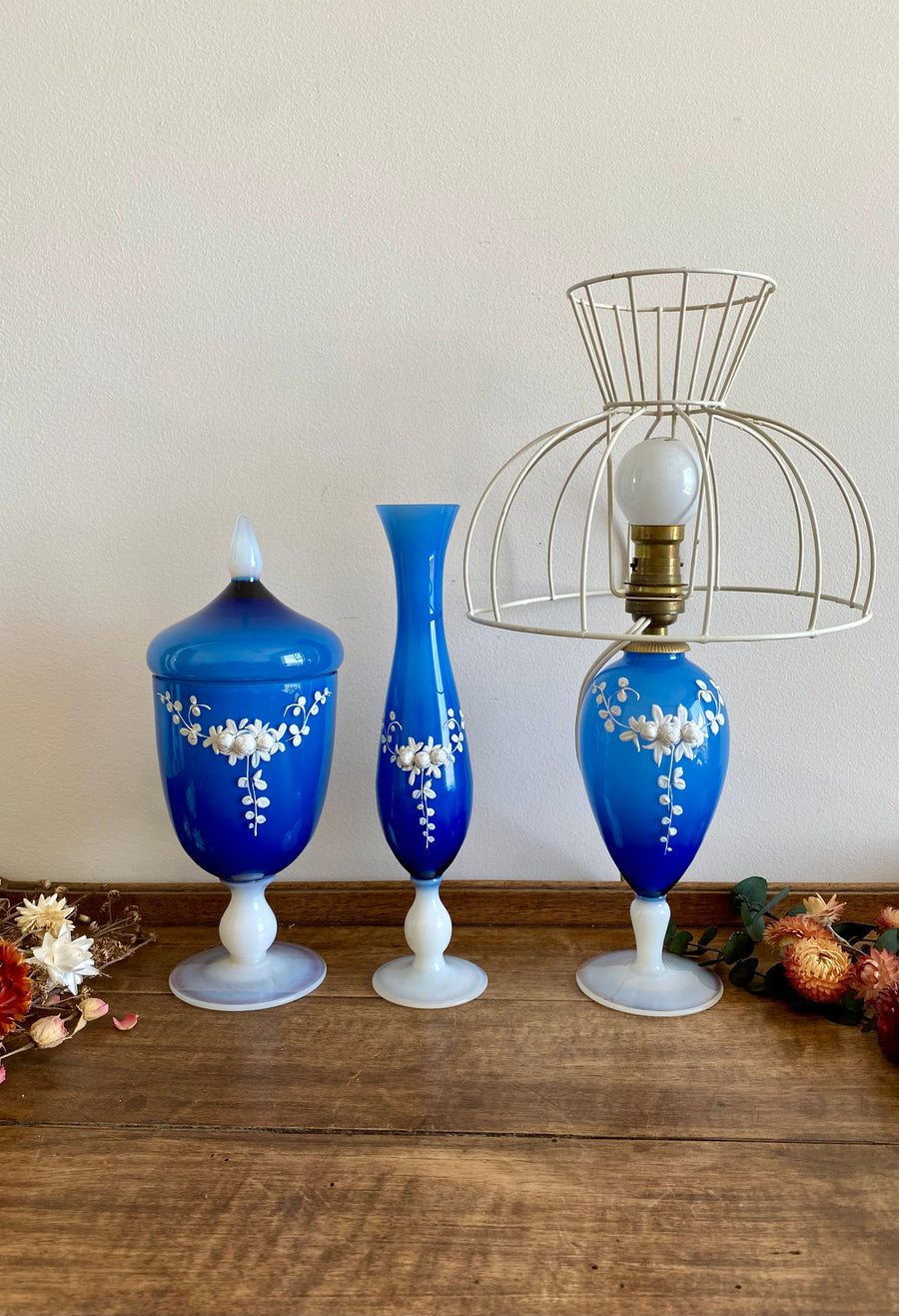 Sublime lot en opaline bleue orné de petites fleurs blanches incrustées