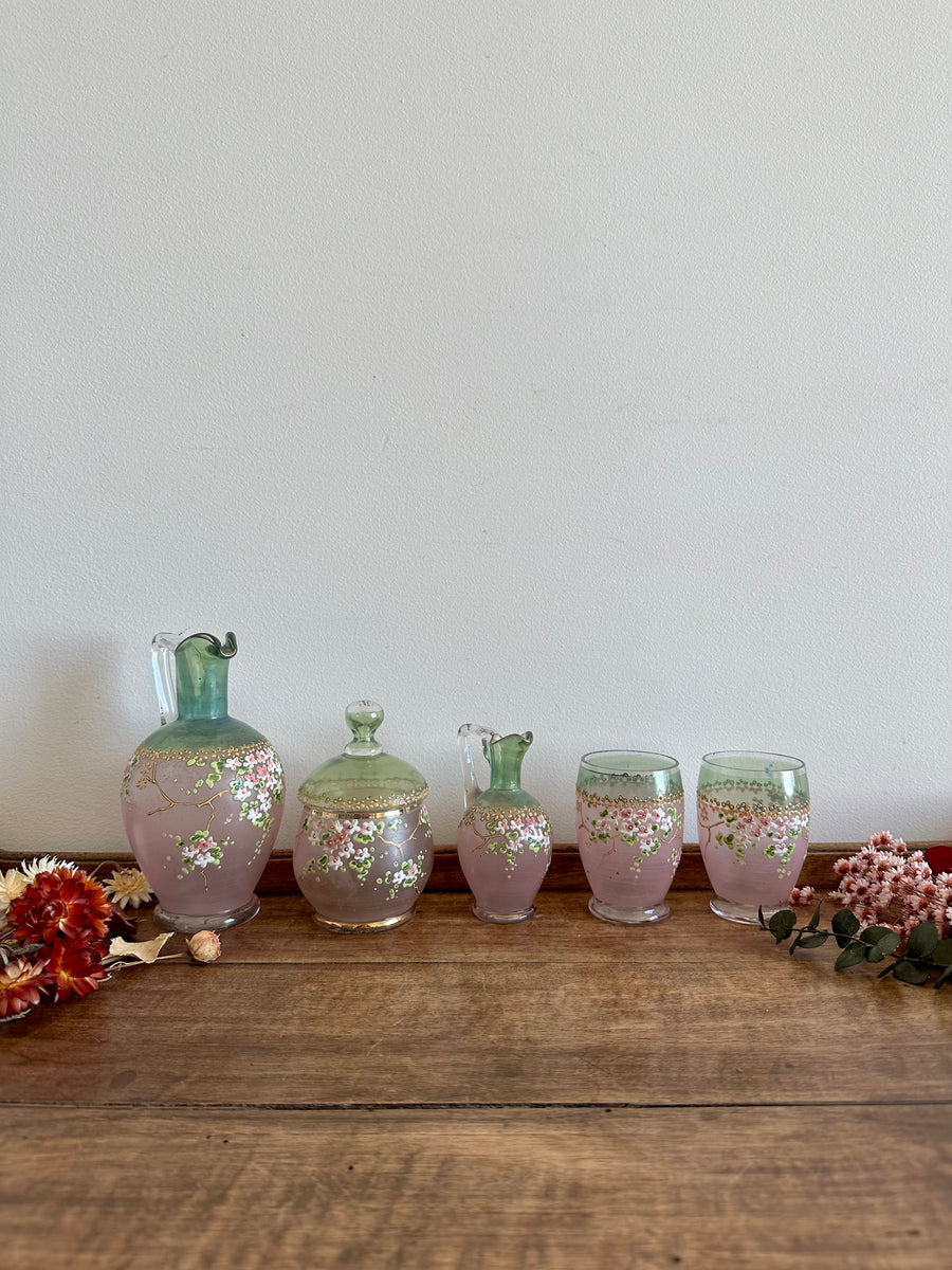 Délicat ensemble en verre émaillé aux jolis tons roses verts et or. Ornements rehaussés à la main. Lot composé de deux verres, d'une cruche, d'un petit pichet, et d'une bonbonnière. A noter: objets anciens présentant de jolies traces du temps dont une légère imperfection au niveau du rebord d'un des petits verres.
