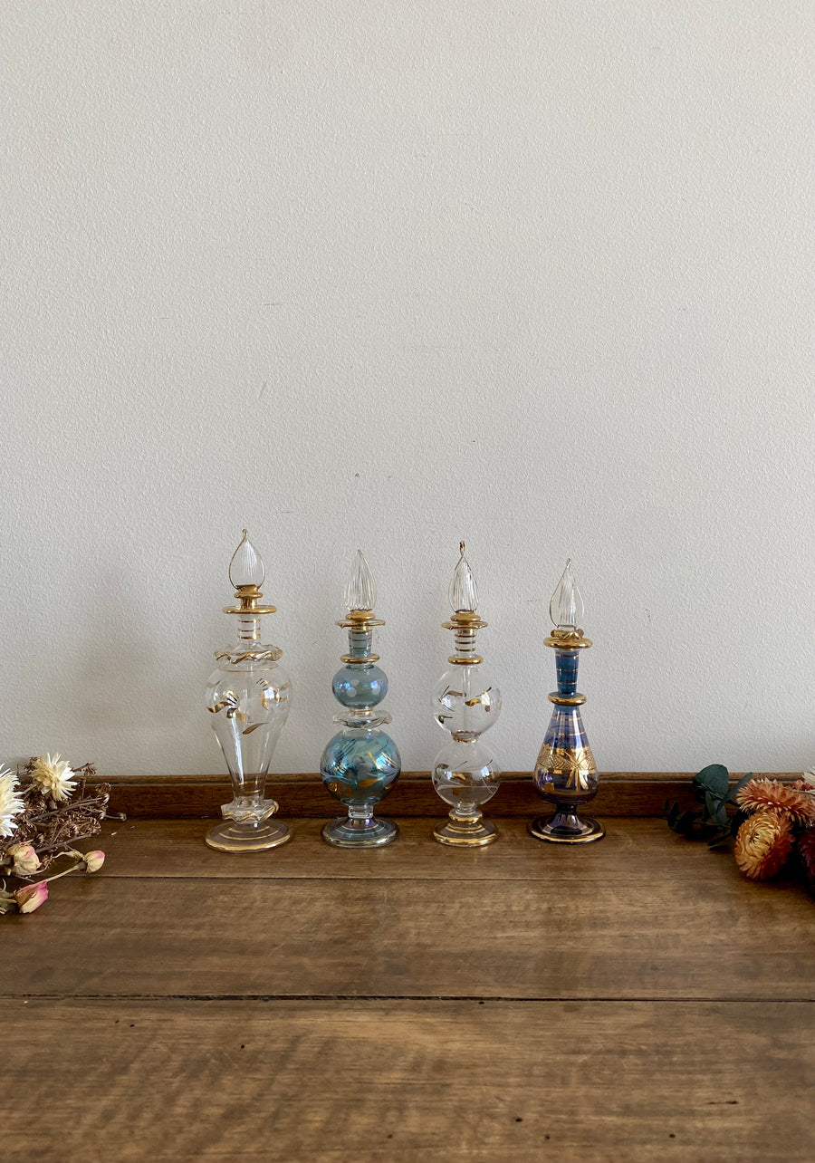 Assortiment de 4 ravissantes petites fioles à parfum vénitiennes, deux transparentes et deux aux tons dégradés de bleus.