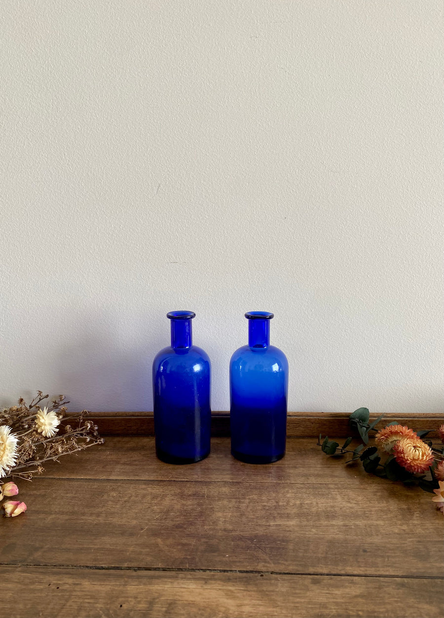 Duo de petits flacons en verre anciens couleur bleu roi.