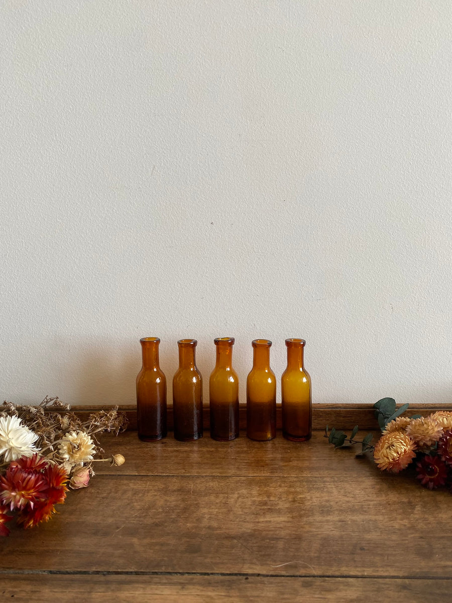 Adorable lot de 5 petites bouteilles anciennes en verre ambré. Présentent des petites traces du temps qui leur donnent tout leur charme.