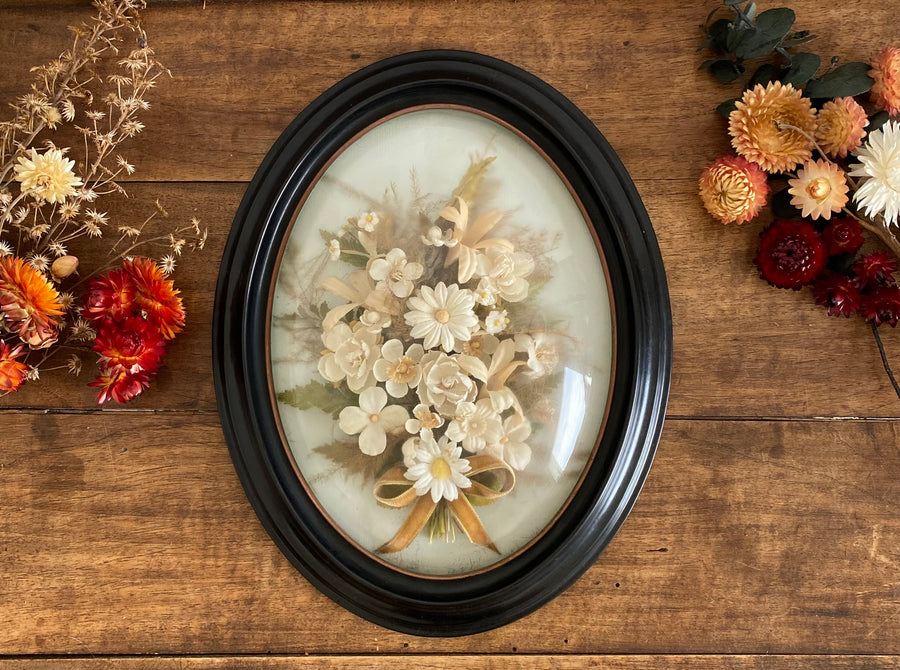 Ravissante composition florale dans les tons blanc et crème. Fleurs en tissu sous verre bombé cerclé de noir.