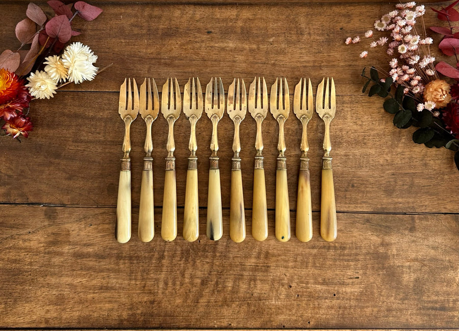 Fourchettes à dessert en bakélite et laiton vintage x 10