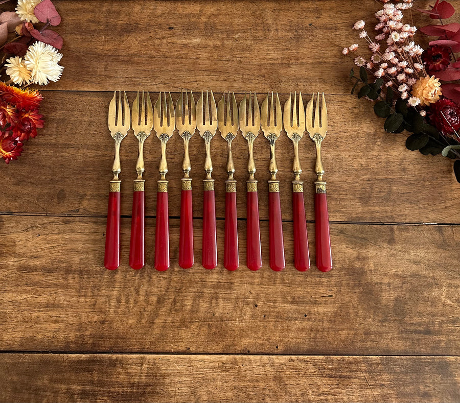 Jolies fourchettes à dessert en laiton avec leurs manches en bakélite rouge. Lot de 10 fourchettes vendues ensemble. Estimation années 60.