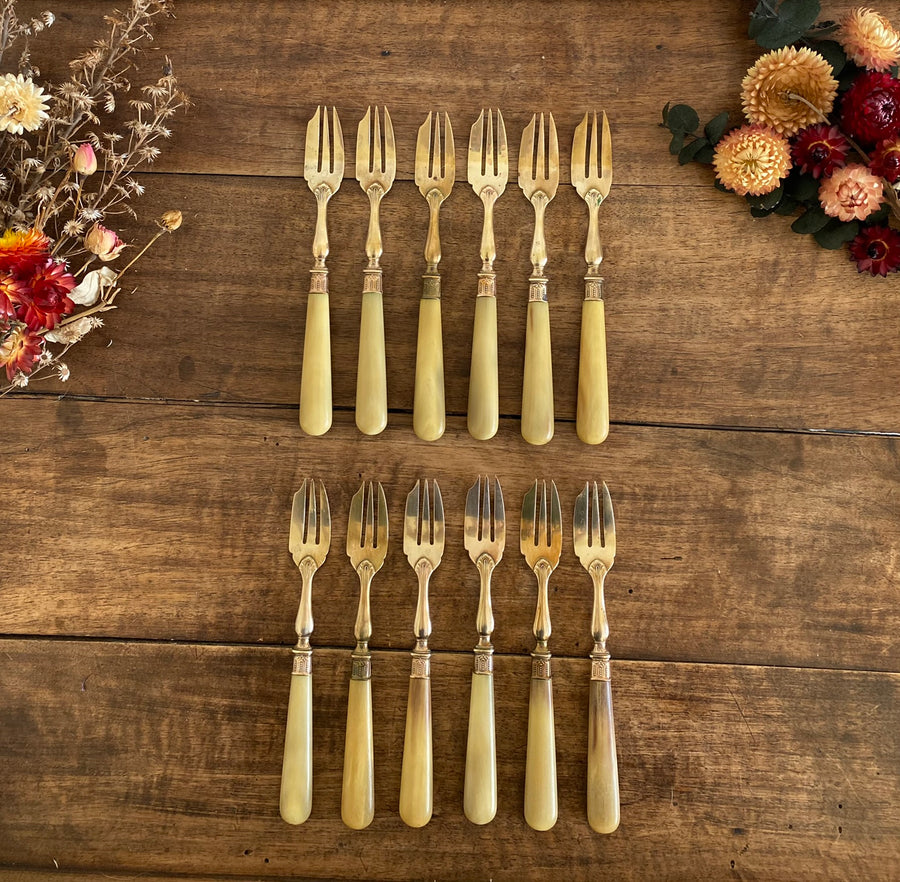 Lot de 12 adorables petites fourchettes à dessert en laiton. Vendues ensemble