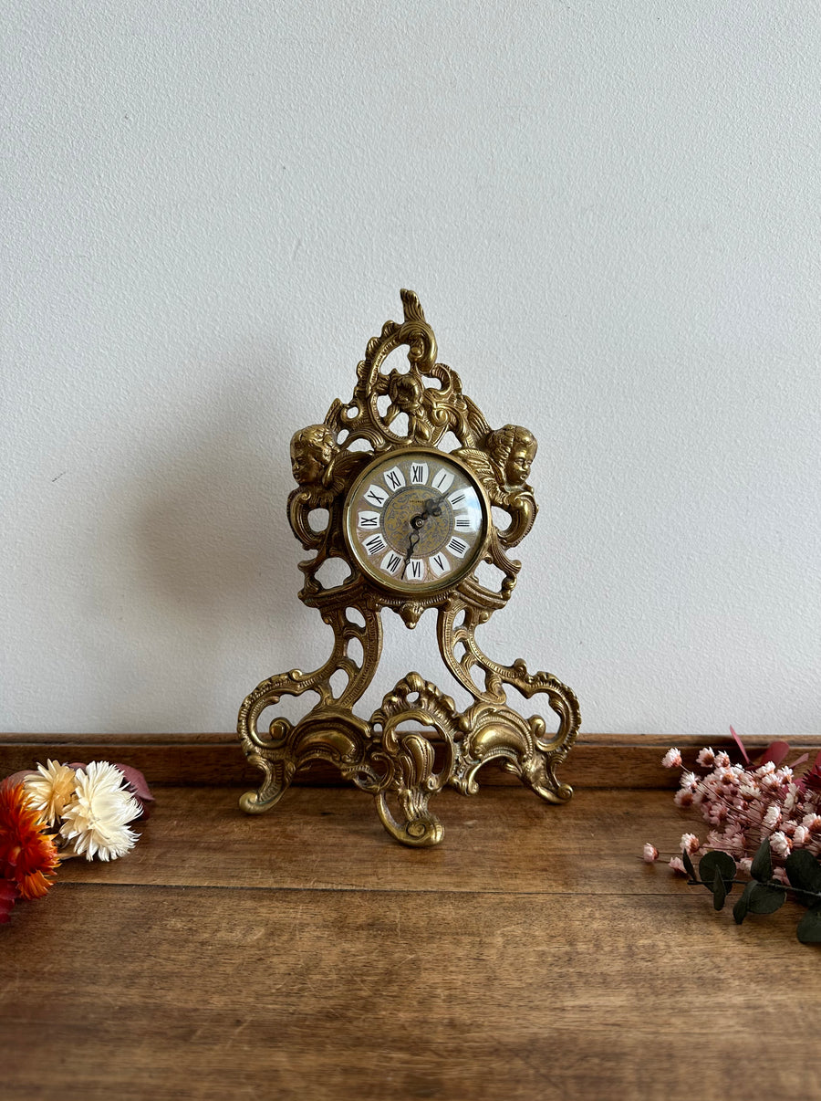 Superbe horloge de table Splendex en bronze de fabrication Allemande. Décor angelots. Doté de 4 pieds travaillés. Ne fonctionne pas mais pourra être mis en état par un expert. Estimation années 60. Numéroté 0/218