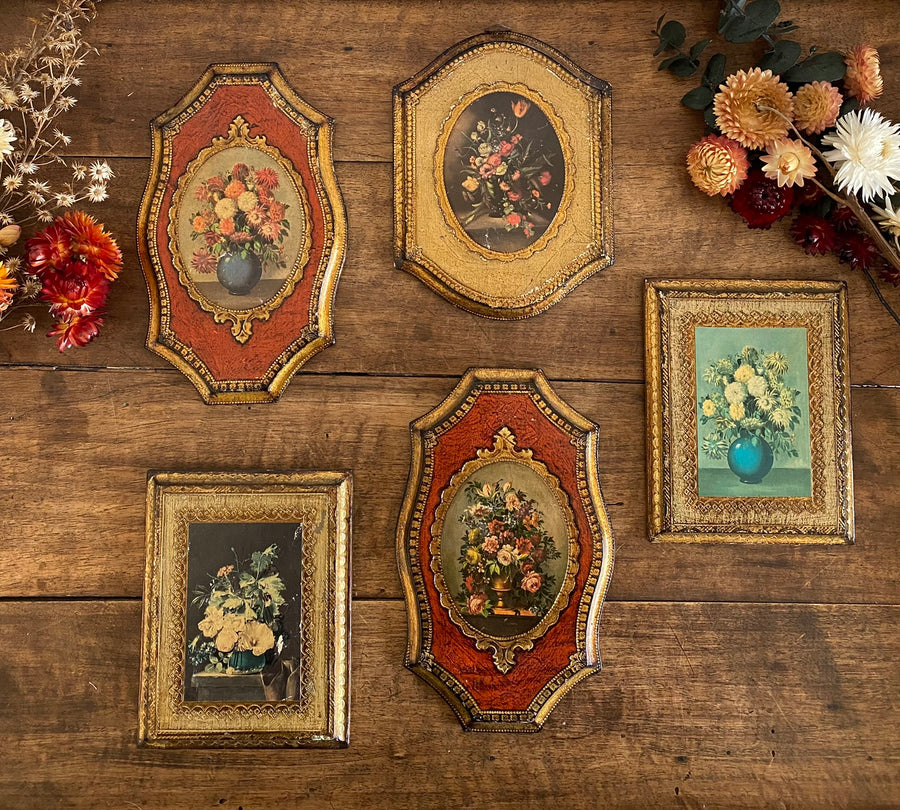 Sublime lot de petites icônes dorées style florentin, décorées de jolis bouquets de fleurs. Vendues séparément.