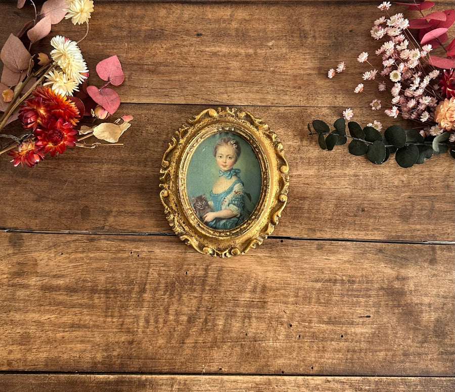 Jolie impression sur tissu représentant une jeune fille au chat de Jean Baptiste Perronneau. On aime le dégradé de bleu dans son beau cadre en bois rococco doré. Estimation années 40.