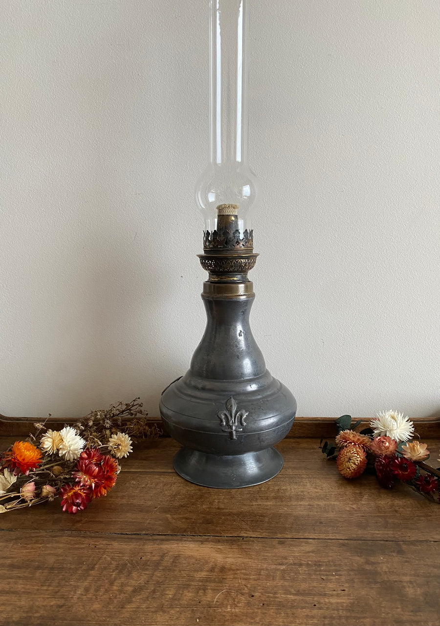 Élégante lampe à pétrole en étain avec motifs fleurs de lys