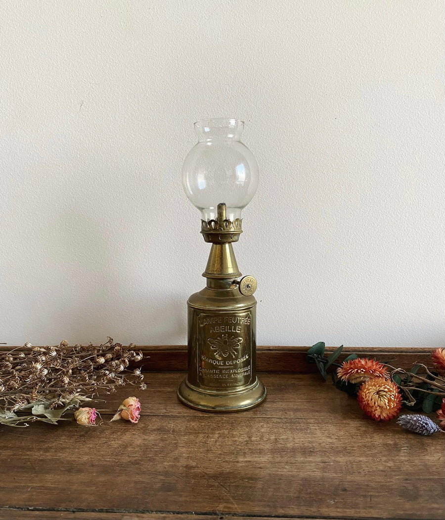 Jolie petite lampe à pétrole décorative Feutrée Abeille en laiton et verre, idéale pour décorer une étagère ou un meuble.