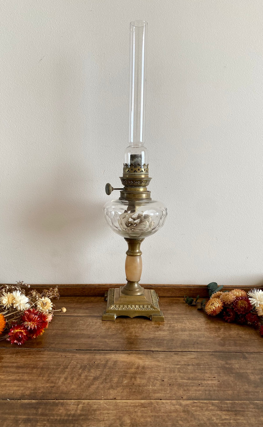 Très belle lampe à pétrole dotée d'un réservoir en verre transparent avec son pied en laiton et onyx travaillé et son socle carré.