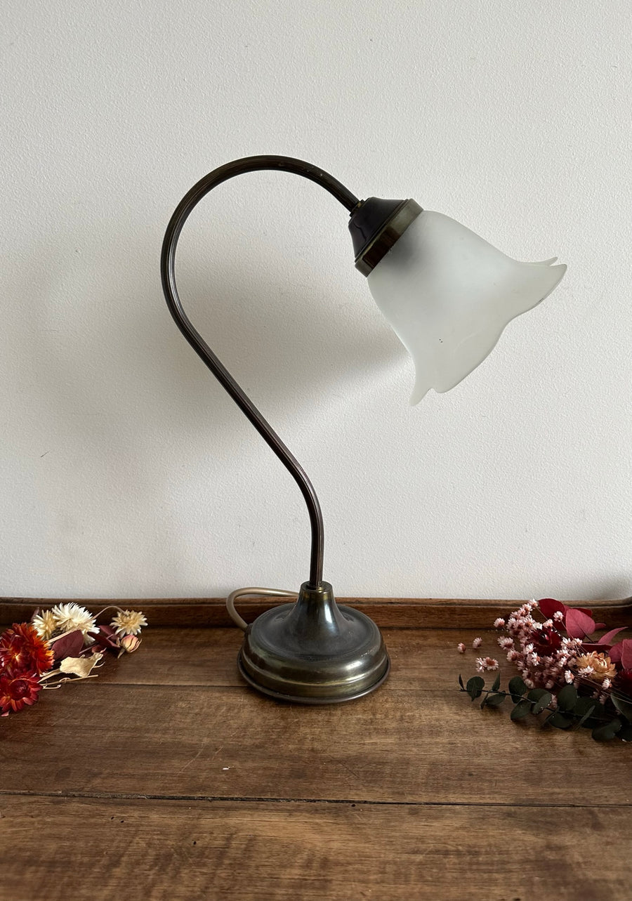 Ravissante lampe col de cygne. On aime son pied en métal patiné légèrement mordoré et sa jolie tulipe en verre fumé. De très discrètes traces du temps sont à noter sur le métal. Cf photos.