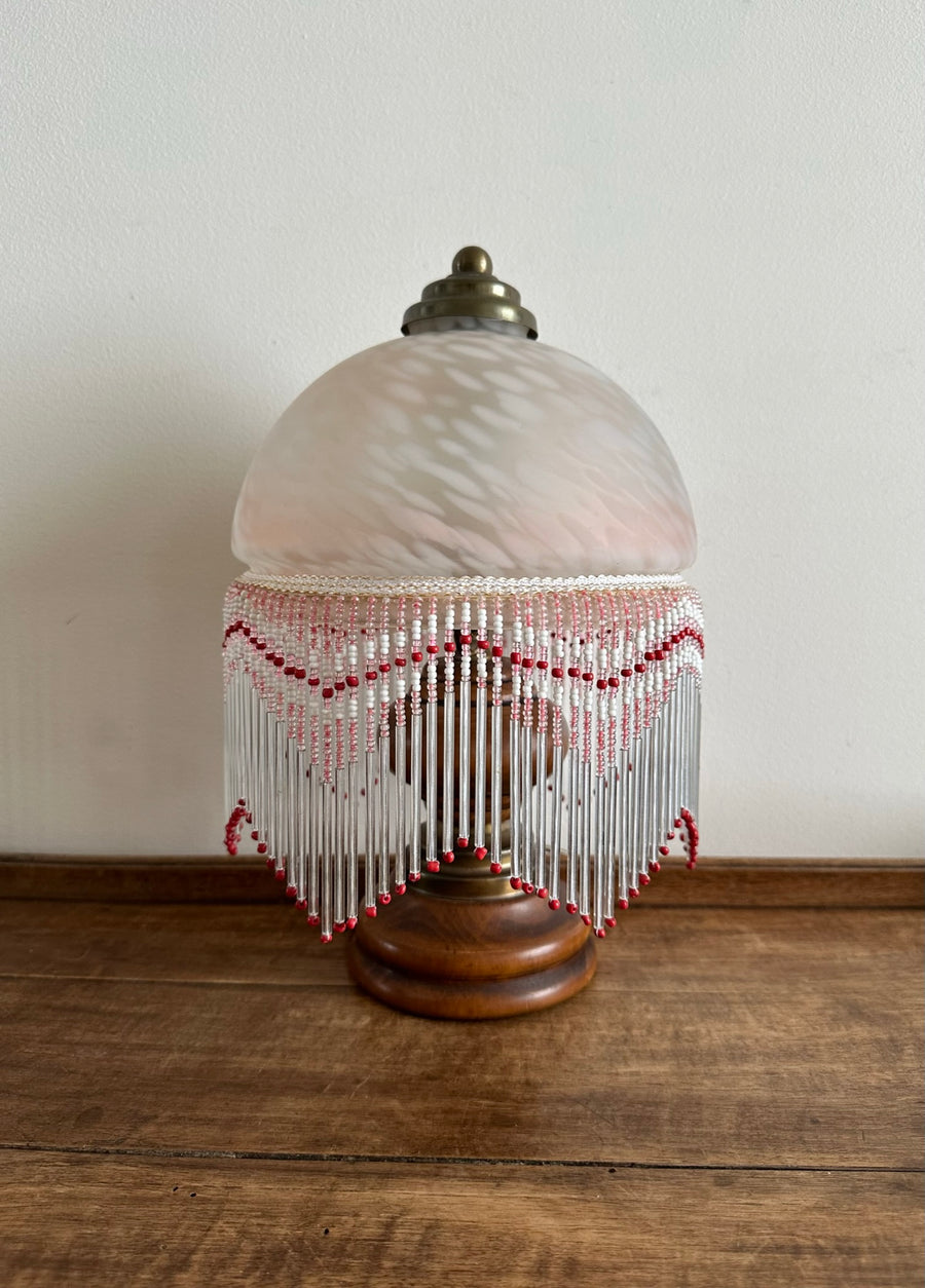 Adorable petite lampe en bois et laiton avec son joli globe décoré d'un rideau de pampilles perlées style charleston. Taille mini idéal pour un chevet, un boudoir, ou une petite table. On adore la douce atmosphère qui s'en dégage. Estimation années 80. A noter, un espace du niveau des pampilles à l'endroit ou les deux bouts du ruban se rejoignent.
