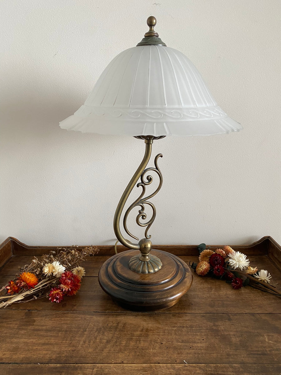 Belle lampe de chevet avec son socle en bois lourd, munie d'un abat jour en verre fumé travaillé et d'une structure en laiton doré. Estimation années 90-00