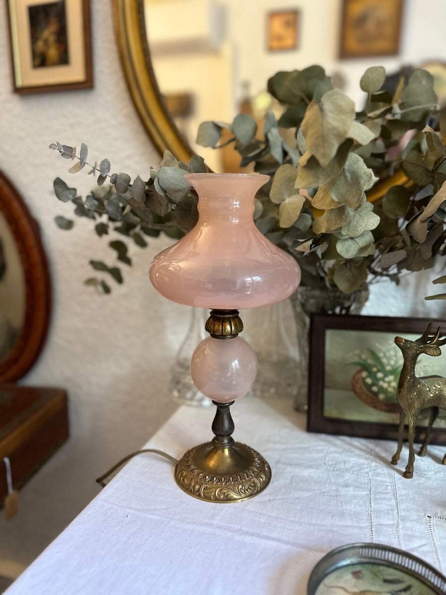 Charmante lampe en opaline rose. Laiton et métal doré. On aime la douceur et l’atmosphère romantique qui s'en dégage.