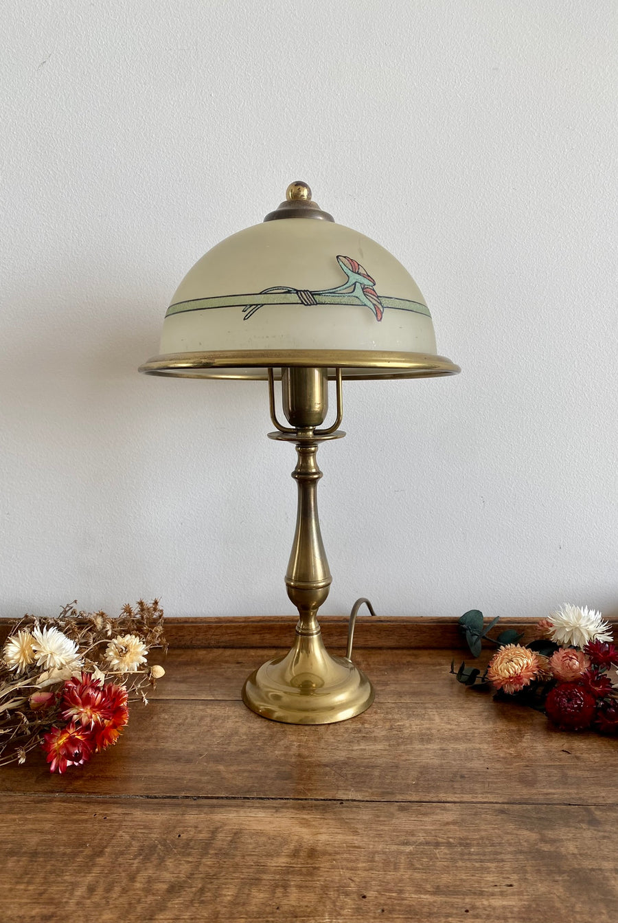 Adorable petite lampe en laiton avec son abat jour en verre décoré de petites fleurs.