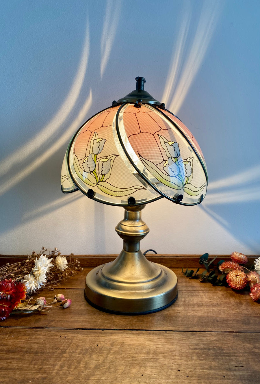 Belle lampe de chevet style Tiffany aux tons de rose vert et violet.