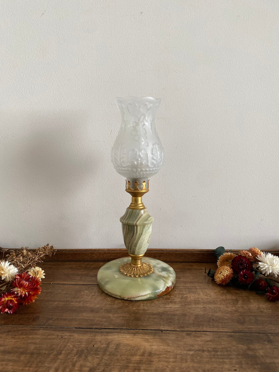 Belle lampe électrique à poser. Pied en pierre d'onyx et globe en verre fumé décoré de petites fleurs.