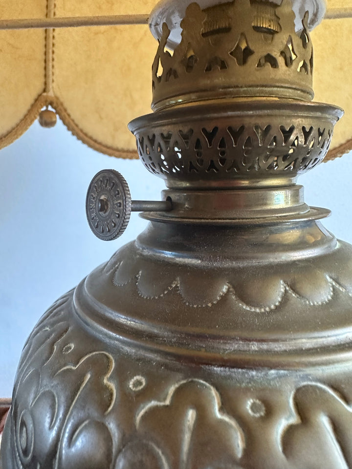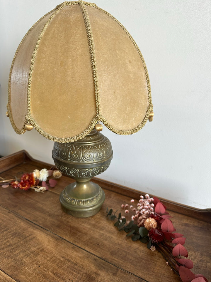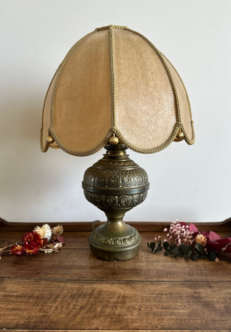 Superbe lampe en laiton et cuivre avec son abat-jour en parchemin satiné qui diffuse une lumière chaude une fois allumée. Dotée d'un galon doré bordé de petites perles. Estimation années 1920.